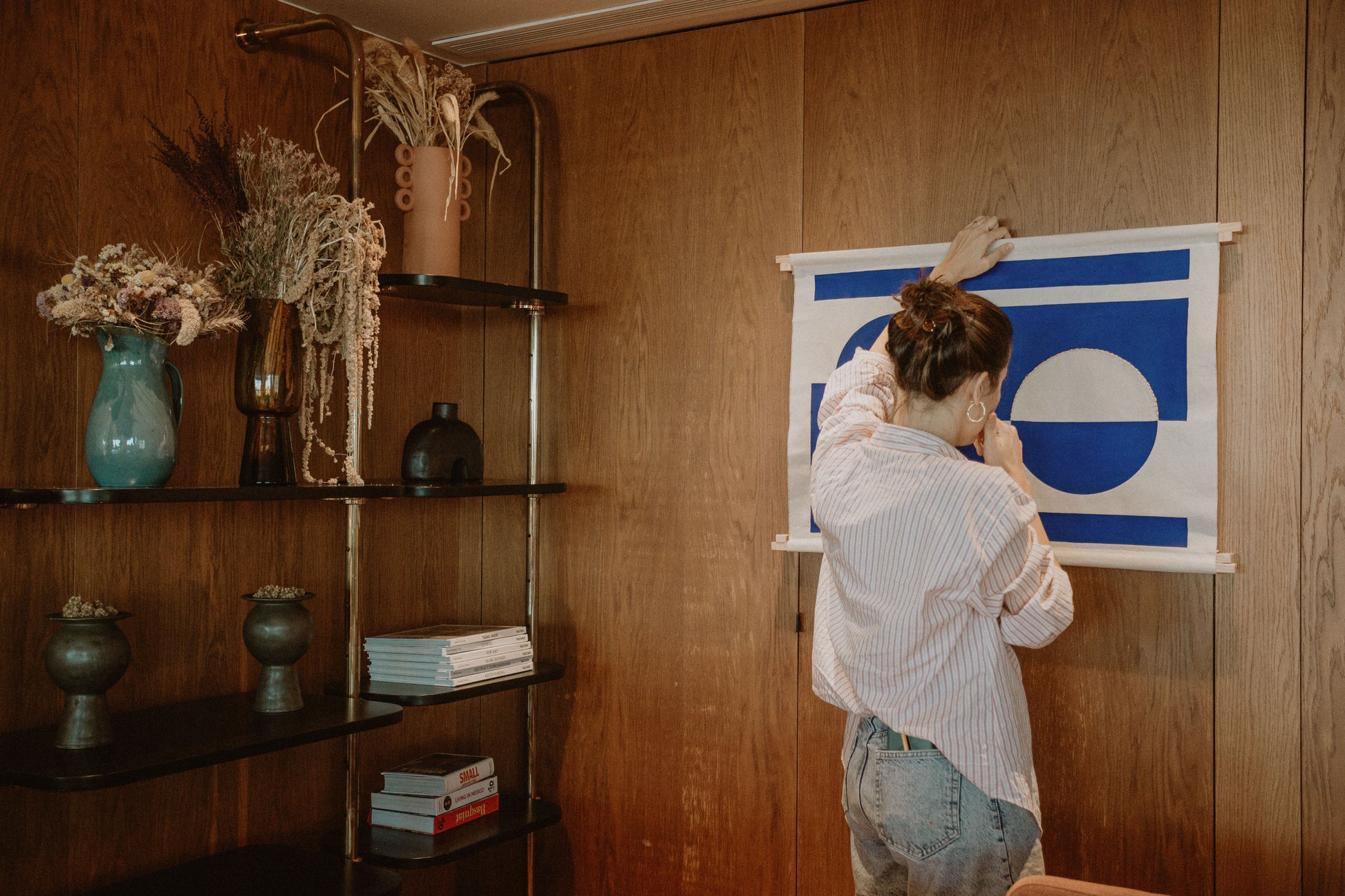 A conversation between form and reflection, Duality explores the meeting point between opposites: light and shadow, stillness and movement, fullness and void. The bold geometry in ultramarine blue unfolds across a field of calm white, creating a visual rhythm that feels both structured and free.