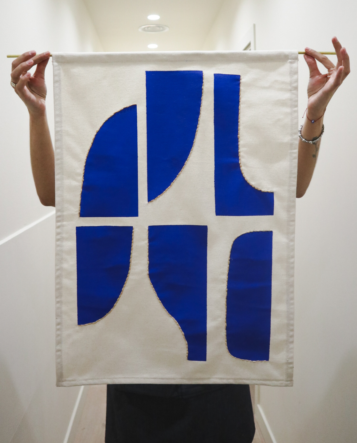 Fluidity in geometry #2 carries a quiet resonance—an ode to balance, structure, and the imperfect beauty of natural forms. Layers of acrylic over raw cotton fabric provide a canvas of muted motion, while raffia threads trace soft disruptions in the symmetry. The brass support adds an architectural lift, turning the piece into a kind of suspended thought—simple, grounded, and quietly profound. Perfect for those drawn to stillness, movement, and the tension in between.