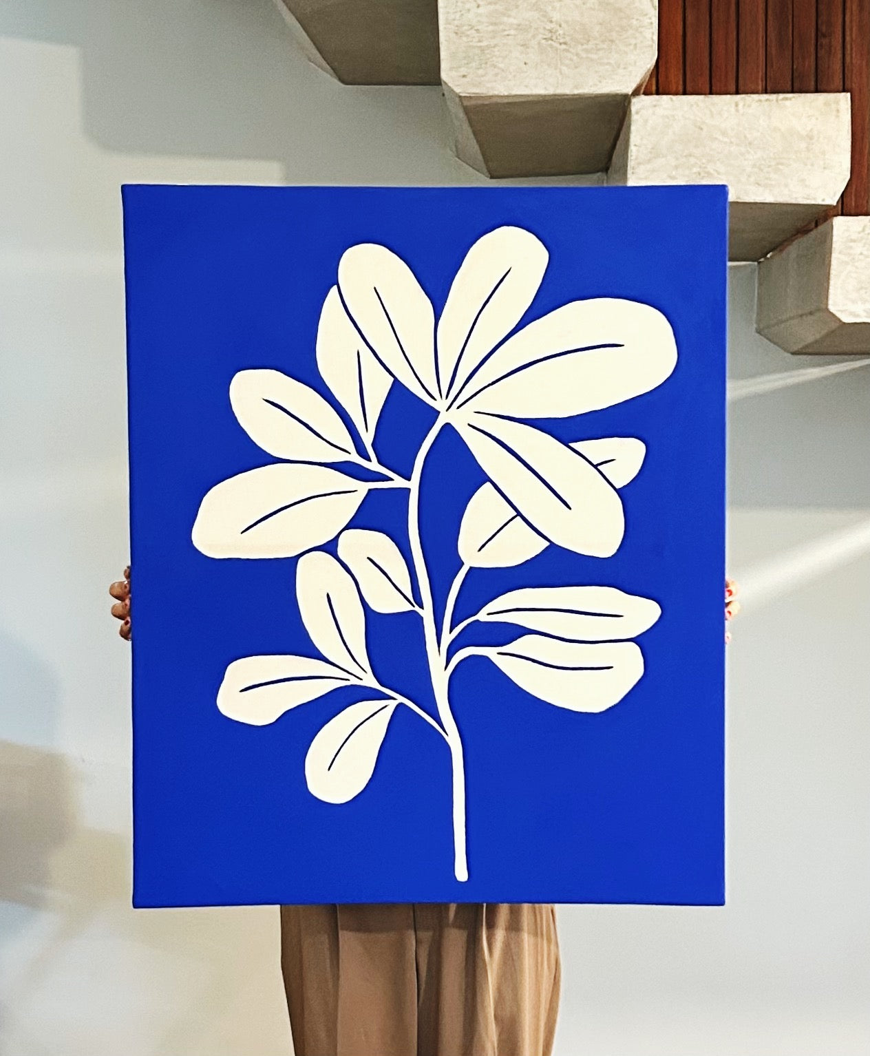 The smallest of the series, Grove #3 offers an intimate window into the same world of layered textures and gentle light. The tactile surface—soft cotton canvas layered with brushstrokes and fine blue glass embroidery—brings a poetic stillness to life. It’s a piece that whispers rather than shouts, perfect for reflective corners and curated walls alike.